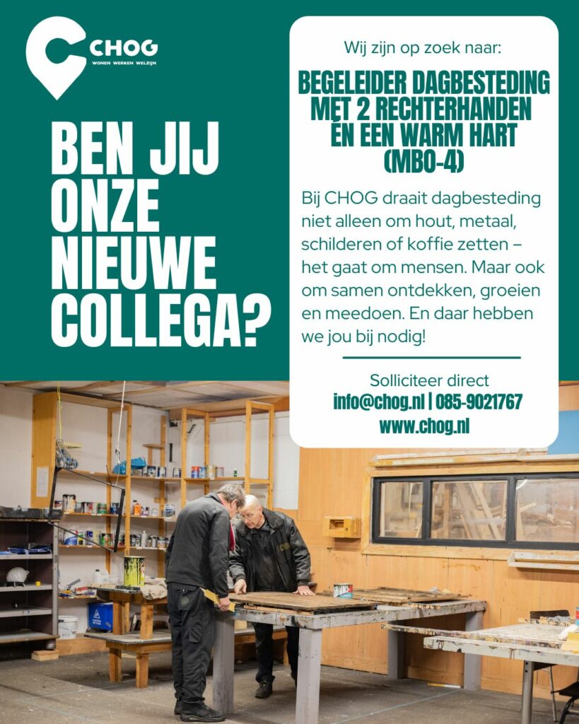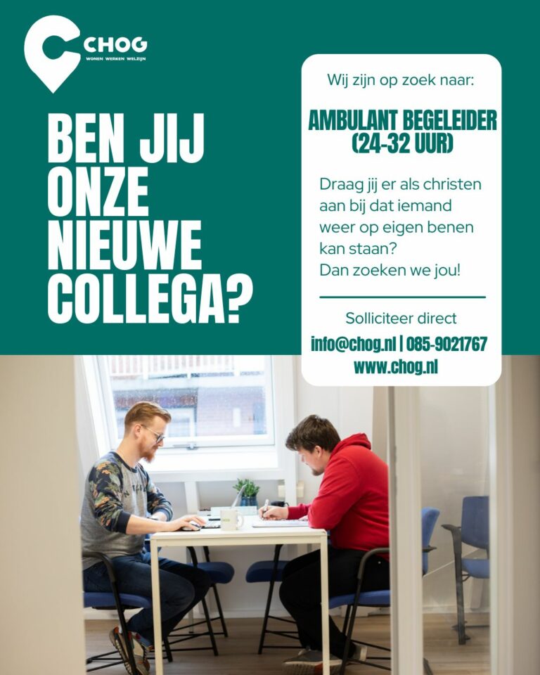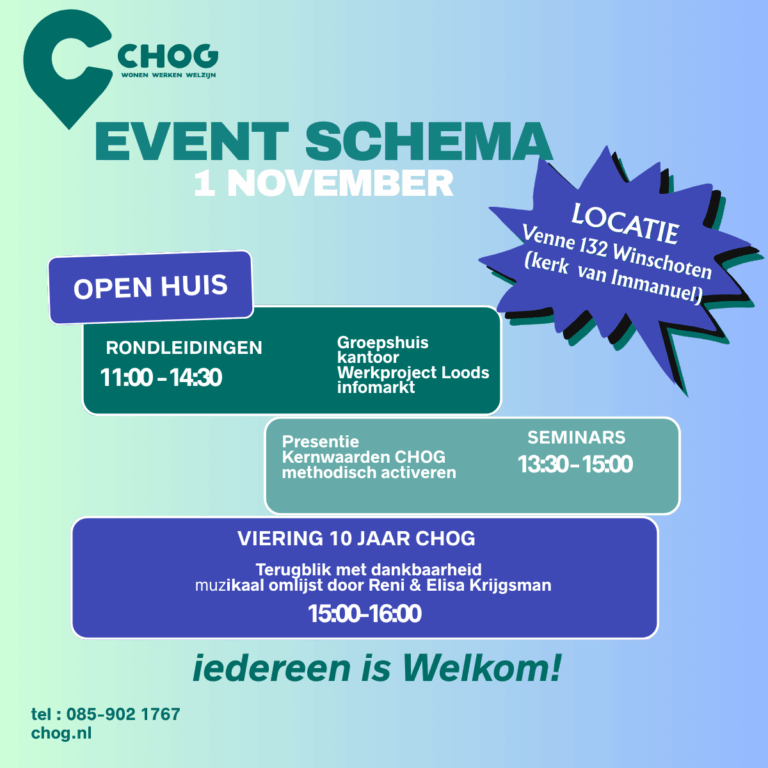 Christelijke Hulpverlening Oost-Groningen (CHOG) is een christelijke hulpverleningsinstantie die zich laat inspireren door de liefde van God voor alle mensen. Wij geloven dat we geroepen zijn om hulp te verlenen aan hulpvragers, ongeacht geloof, afkomst of levensstijl. CHOG biedt hulp aan volwassenen met problemen die hun leven beheersen. Bijvoorbeeld mensen met psychische klachten, psychosociale problemen, een verslaving of een licht verstandelijke beperking (LVB). Wij werken met clusters waarbij de hulp wordt afgestemd op jouw hulpvraag. Wij werken op basis van een Wmo- of Wlz-indicatie en hebben geen wachtlijst.